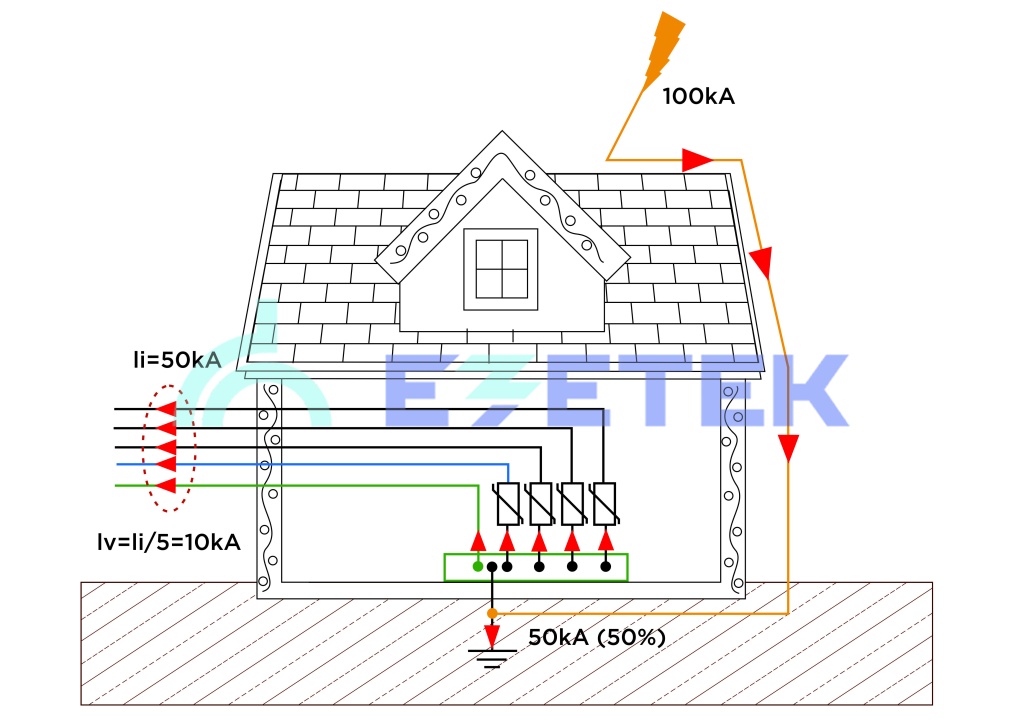 Определить ожидаемый ток в точке установки УЗИП возможно расчётным путем. Существует программное обеспечение, выполняющее такие расчёты в соответствии с требованиями НТД, но для частного дома несложно произвести расчёт «вручную». В НТД, например ГОСТ Р МЭК 61643-12, распределение тока молнии от внешней СМЗ предлагается считать кратно деля общий ток на количество входящих в объект коммуникаций, предполагая отведение половины тока молнии попавшего в СМЗ объекта в систему заземления. Примеры подобных расчётов приведены на рисунке 1 и достаточно часто встречаются в различных материалах по защите от перенапряжений. Значение тока в каждой обслуживающей системе (Ii) может быть оценено по Ii = Is / n, где n- число обслуживающих систем. Для оценки тока Iv в каждом отдельном проводнике полный ток кабеля Ii делят на число проводников m, тогда Iv = Ii /m/