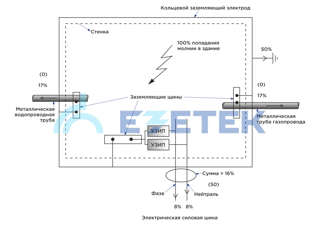 - имеется ввод коммуникаций, потенциально подверженных прямым токам молнии, например воздушных линий электроснабжения и связи