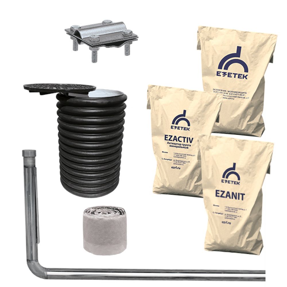 Комплект электролитического заземления EZ – 3 Г предназначен для монтажа в траншею длиной 3 метра. Он включает в себя горизонтальный L-образный электрод, специальные составы для заполнения электрода и пространства вокруг него, контрольно-измерительный колодец, элементы для соединения электрода с горизонтальным проводником и для герметизации этого соединения.
